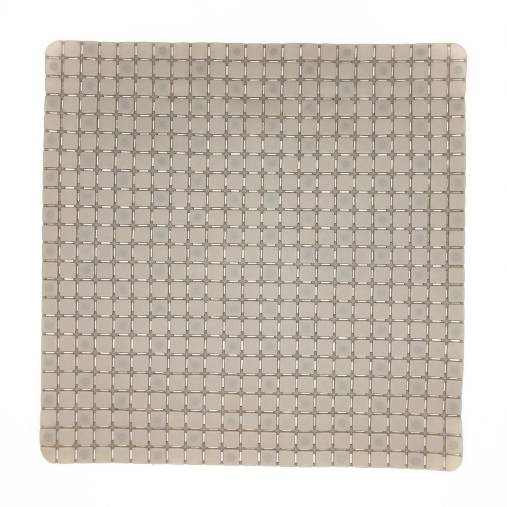 Non-slip mat designed for use inside the bathtub. The bottom surface features numerous suction cups that keep the mat securely in place.