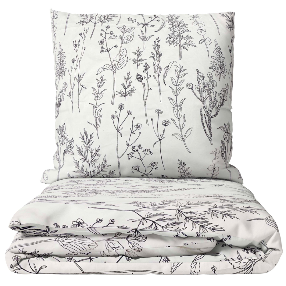 Natural white bedding adorned with a minimalist botanical line pattern in dark violet. The gradient from light grey to deep violet creates a soft, harmonious, and calming design – ideal for a modern interior that values naturalness and aesthetics.