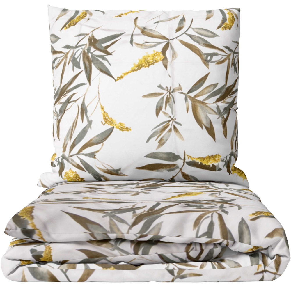 White bedding set with olive leaf pattern. The set features a light, almost white background decorated with brownish-green leaves and mustard-toned blossoms. The natural color palette creates a harmonious and airy look reminiscent of delicate botanical illustrations. The leaf design appears soft and balanced, giving the overall aesthetic an elegant and calm character. It pairs beautifully with neutral or nature-inspired interiors.