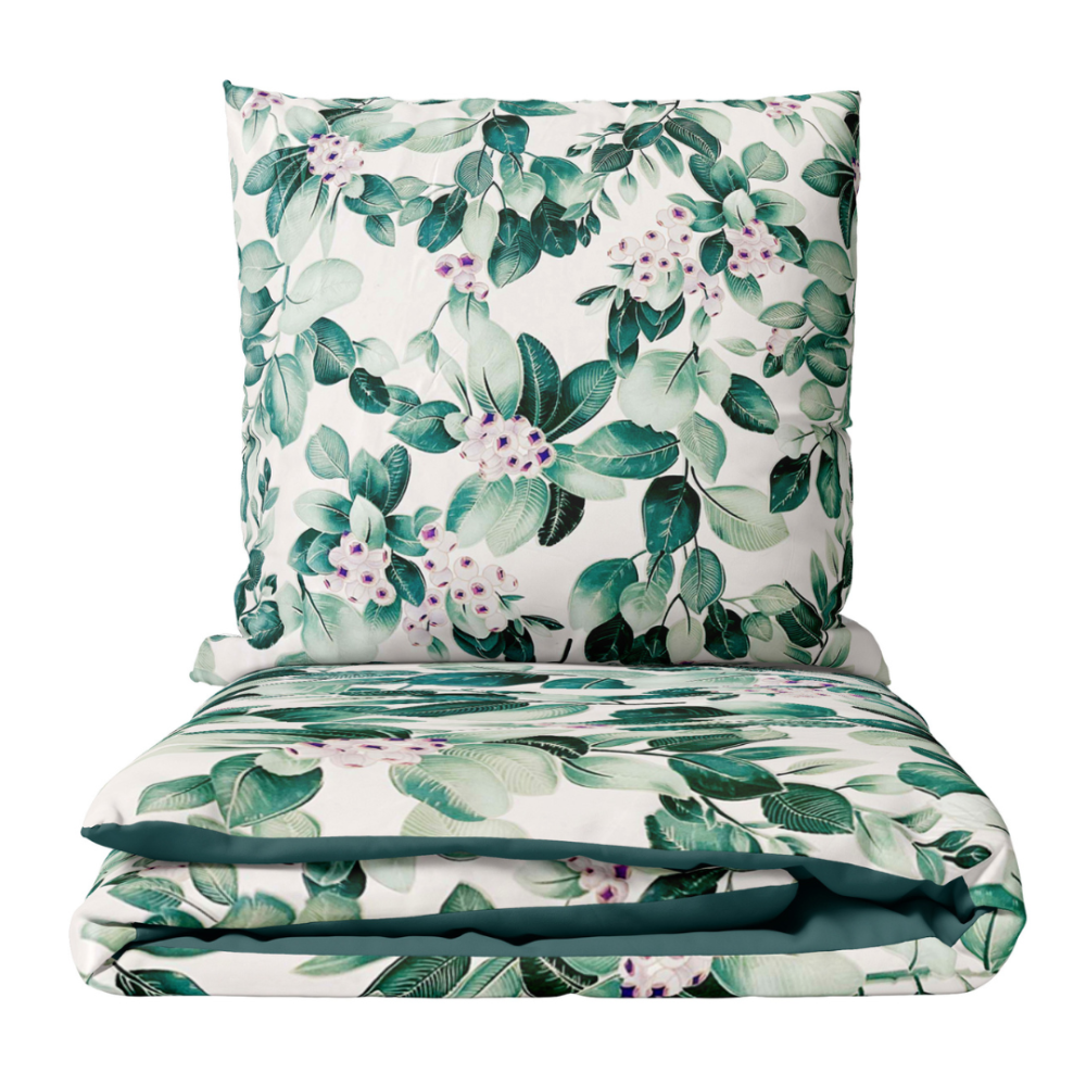 Imagine a bedding set where the white background is adorned with a symphony of medium-sized green leaves and delicate pink berries. The colors of this design are a true delight, bringing a sense of natural elegance and tranquility.