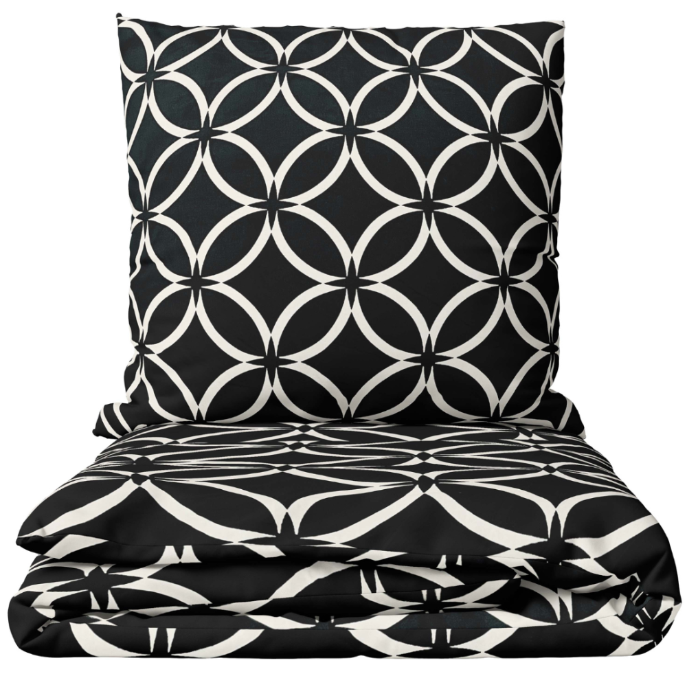 The design of this bedding set features a deep black background with a striking geometric pattern of overlapping white circles, creating the impression of stylized flowers or petals. The pattern is arranged evenly, giving a symmetrical and modern look. The sharp contrast between black and white adds expressiveness and visual structure to the design. This is an elegant, minimalist choice for a contemporary interior dominated by bold color schemes and clean lines.