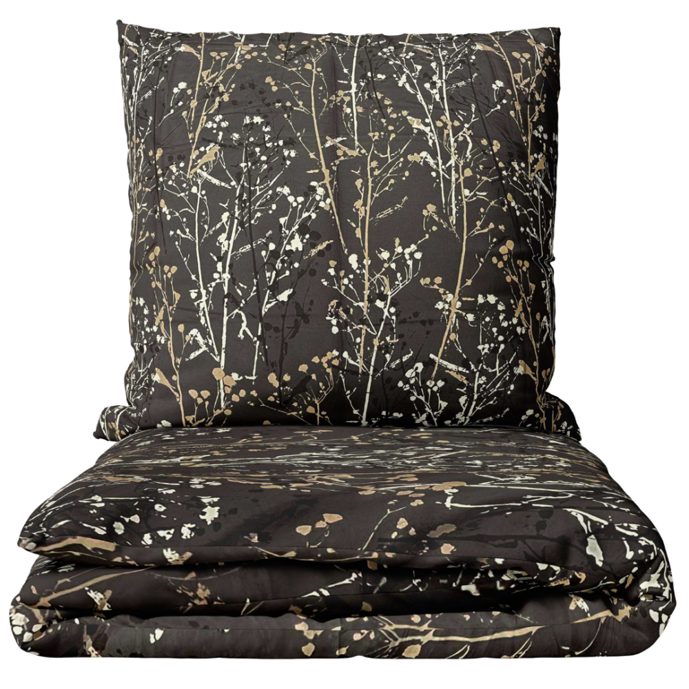Dark-toned bedding set with branch and leaf pattern. The design evokes the calmness of nature, adding subtle sophistication to the bedroom. Earthy hues and a softly glossy finish create a cozy yet elegant atmosphere. A harmonious choice for those who appreciate a natural and modern interior style.