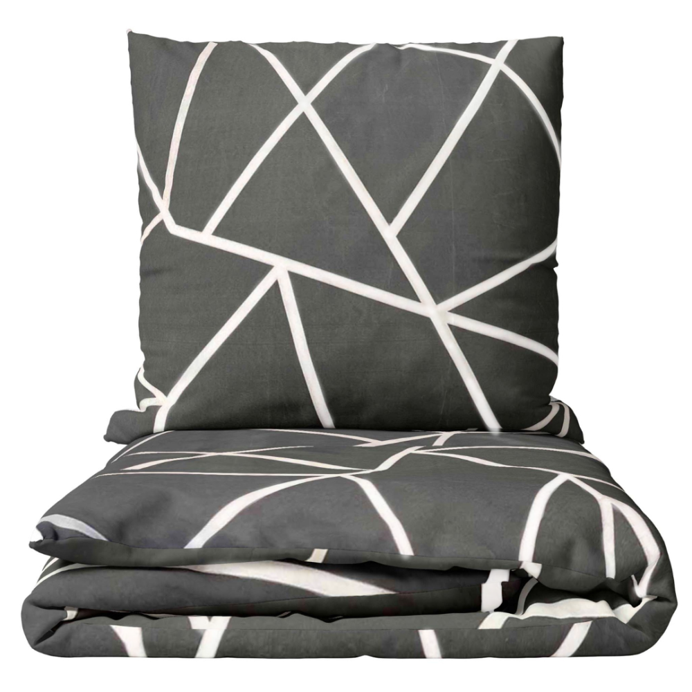 Transform your bedroom into an elegant oasis with our stunning dark grey bedding set. The eye-catching design of crisp white lines intersecting in various directions creates a dynamic and modern pattern. The deep, rich grey background perfectly complements the bright white lines, forming a striking contrast that is both stylish and visually appealing.