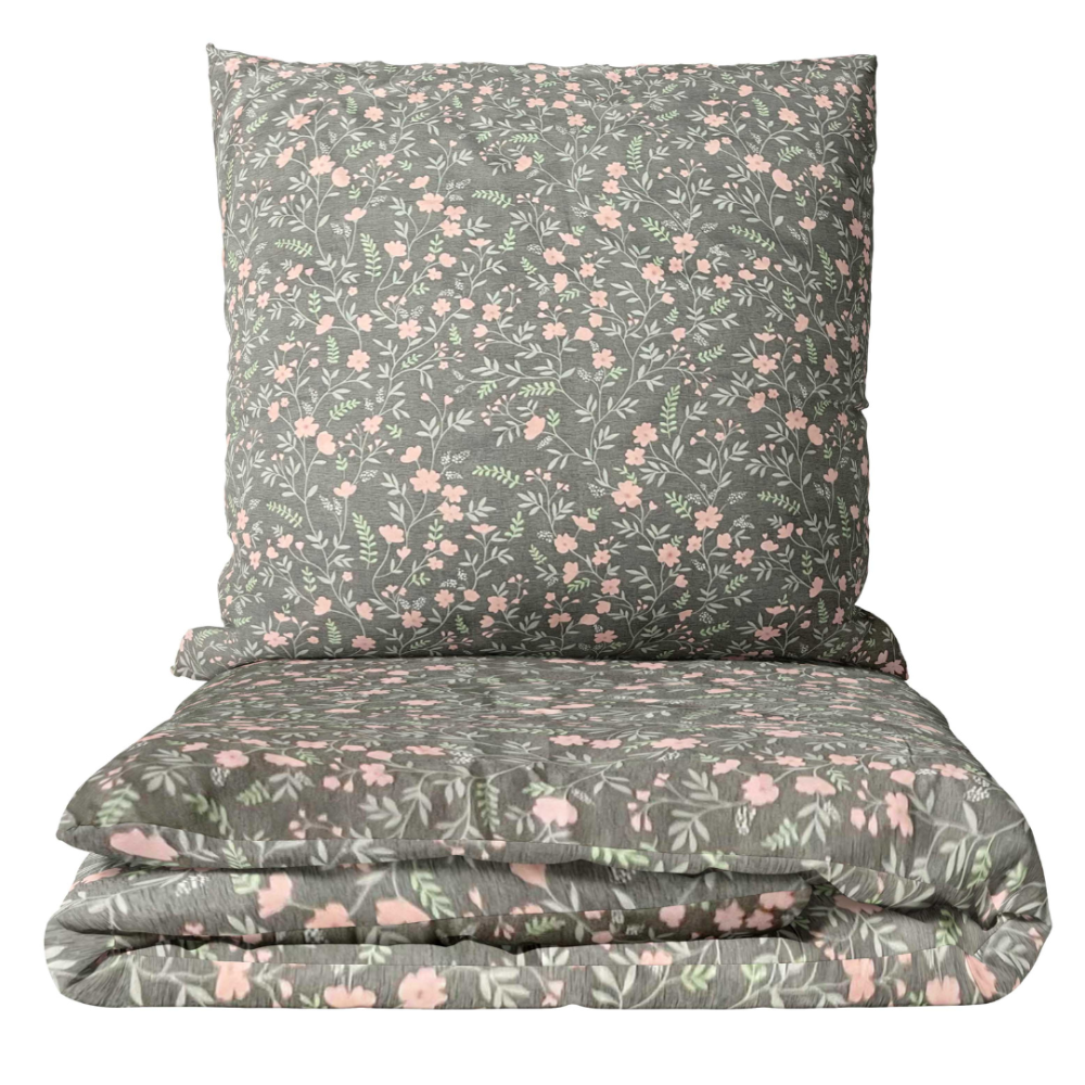 This elegant gray bedding set is gently accented with soft pink and green tones, while delicate leaves add charm and a touch of natural beauty. The cool gray base creates a calming, neutral backdrop, allowing the soft pink shades and fresh green leaves to stand out, forming a balanced and tranquil look.