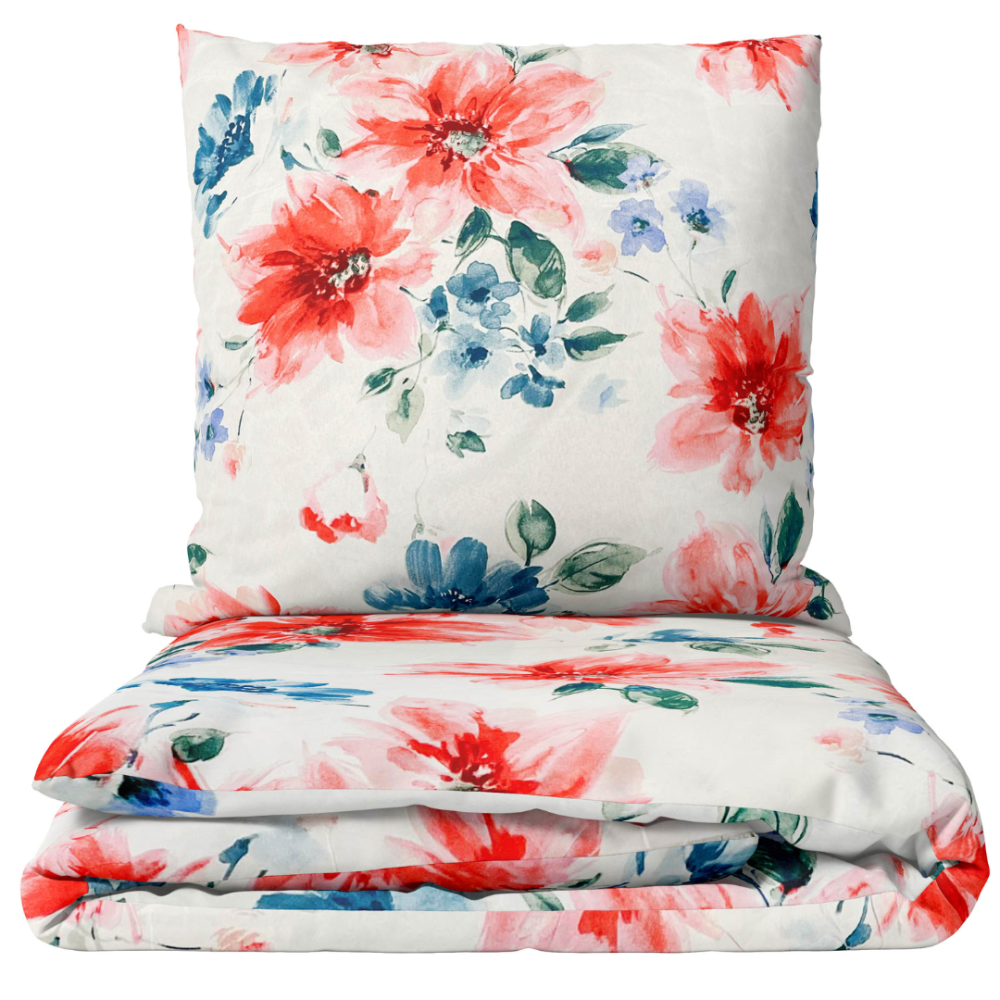 This bedding set features a spacious watercolor-style floral composition on a clean white background. Radiant coral-red blossoms are combined with subtle blue accents and green leaf motifs, creating a refreshing spring and summer atmosphere in your bedroom.