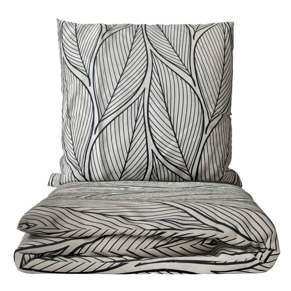 Embrace the harmony of simplicity and boldness with this luxurious bedding set. The light background combined with bold black leaf patterns creates a timeless aesthetic that effortlessly enhances any bedroom interior. Add a touch of modern sophistication to your sleeping space with this unique bedding set.