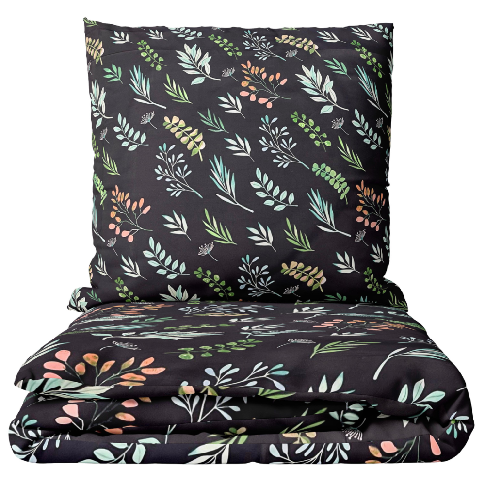 This bedding set stands out with its elegant, nature-inspired design. The dark black background creates a striking contrast, highlighting delicate botanical motifs. Leaves in shades of green, blue, pink, and yellow appear as if gently scattered, resembling those fallen on the ground in nature.