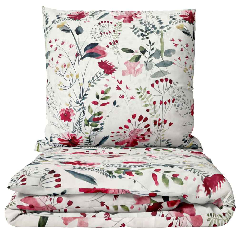 This bedding set radiates spring-like lightness – delicate illustrations of pink, gray, and yellow wildflowers are scattered across a white background, creating a romantic, bright, and nature-inspired design. Perfect for those seeking coziness, softness, and a refreshing atmosphere in their bedroom.
