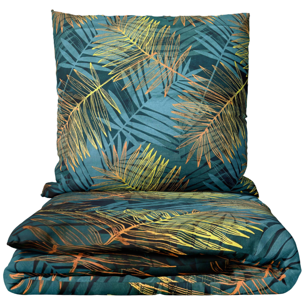 This dark green bedding set with a tropical leaf pattern exudes an exotic and calming vibe. The blend of green, yellow, and golden hues brings warmth and a touch of nature to your bedroom. Perfect for those who seek freshness and natural harmony in their interior. The tropical design adds a cozy, stylish, and nature-inspired atmosphere.