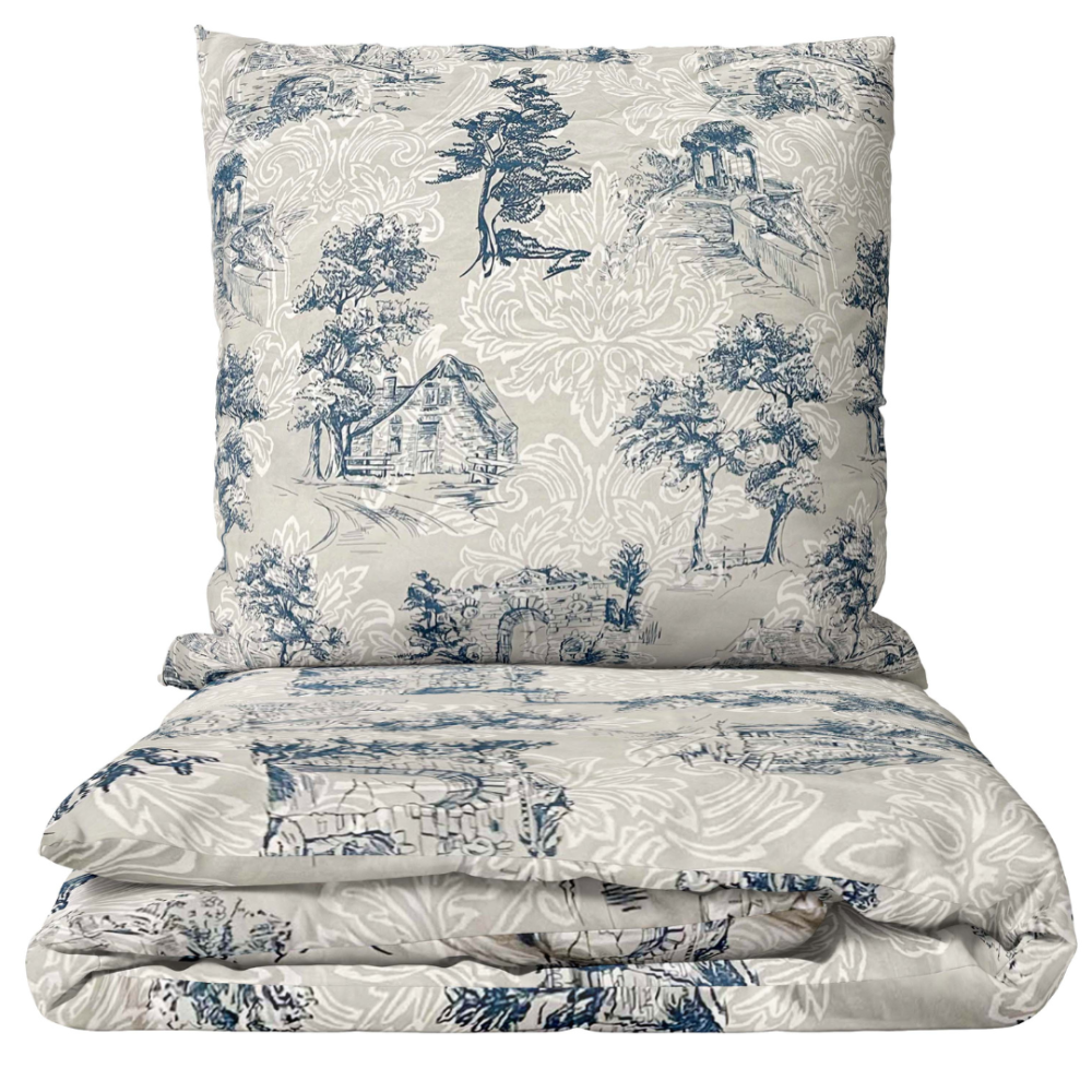 This bedding set radiates classic elegance – the subtle blue landscape pattern on a gray background, reminiscent of an antique engraving, evokes a sense of calmness, tradition, and uniqueness. It perfectly complements a refined and cozy bedroom interior.