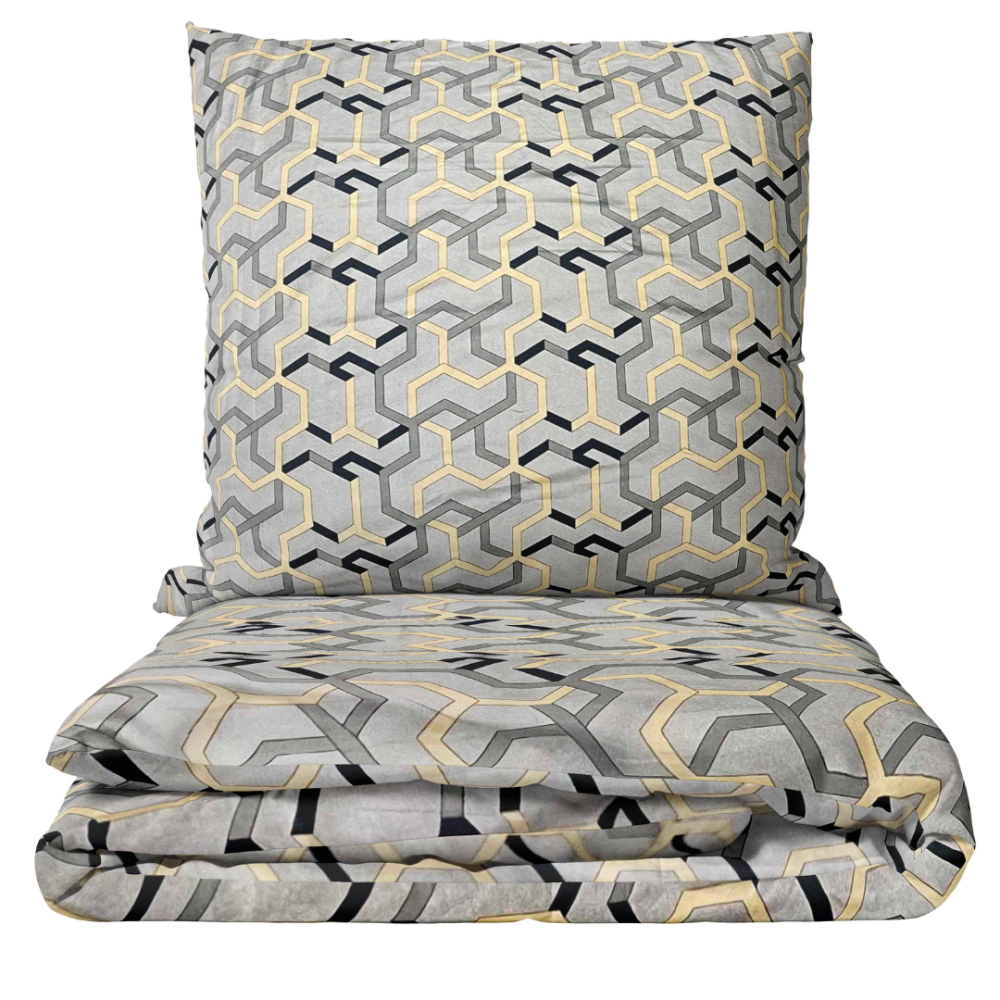 This bedding set features a modern geometric pattern in shades of grey, yellow, and black, bringing a sense of contemporary dynamism and elegance to your interior.