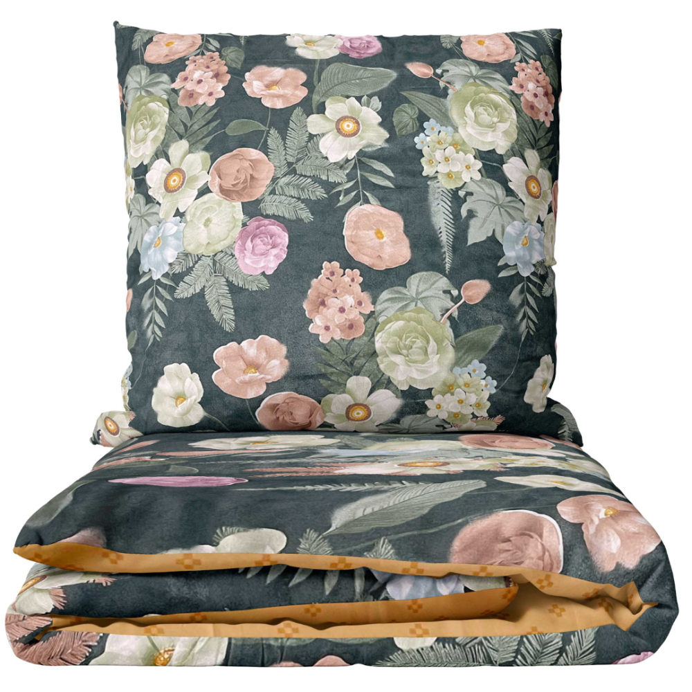 Dark green bedding set with pastel floral pattern. The design beautifully combines the contrast between a dark background and soft flower tones, creating an elegant and cozy mood. Floral motifs add a touch of lightness and natural charm, ideal for refreshing any bedroom. A perfect choice for those who appreciate subtle beauty and classic style.