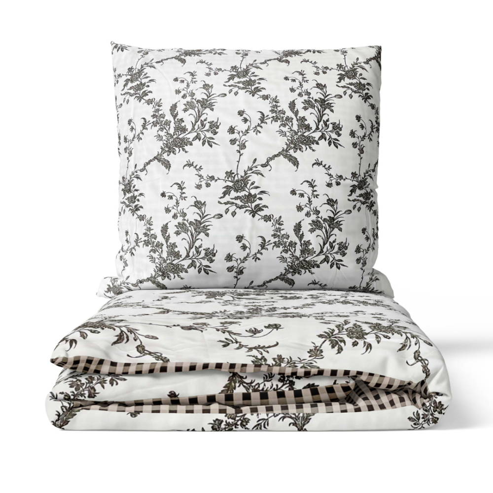 Bring classic elegance to your bedroom with the “Vito” bedding set. Beautiful brown blossoms stand out against the white background, evoking the spirit of summer. Flip the duvet cover to reveal a different look – a brown checkered pattern that adds variety and charm.