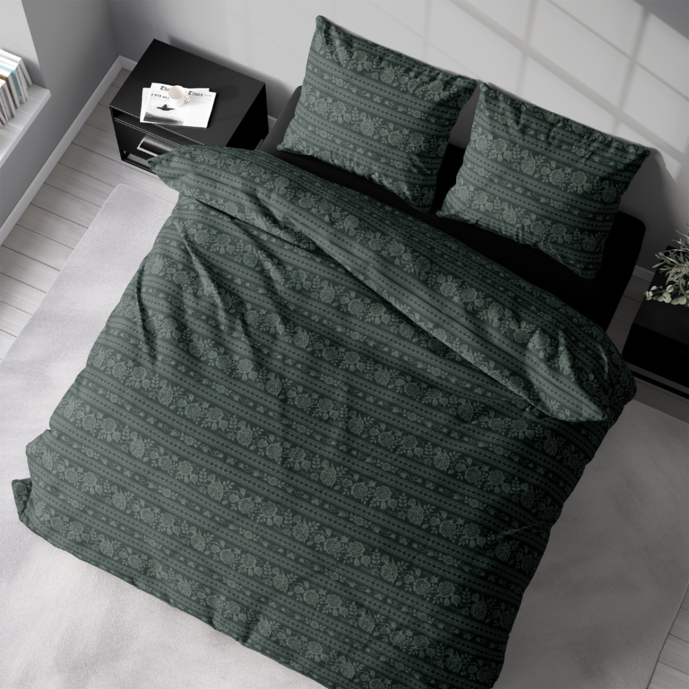Immerse yourself in a realm of deep elegance with this dark green bedding set. The fabric is a tapestry of meticulously detailed lines, celebrating the beauty of nature. Among the patterns, ornate roses and vines subtly unfold, forming a luxurious floral and vine motif.