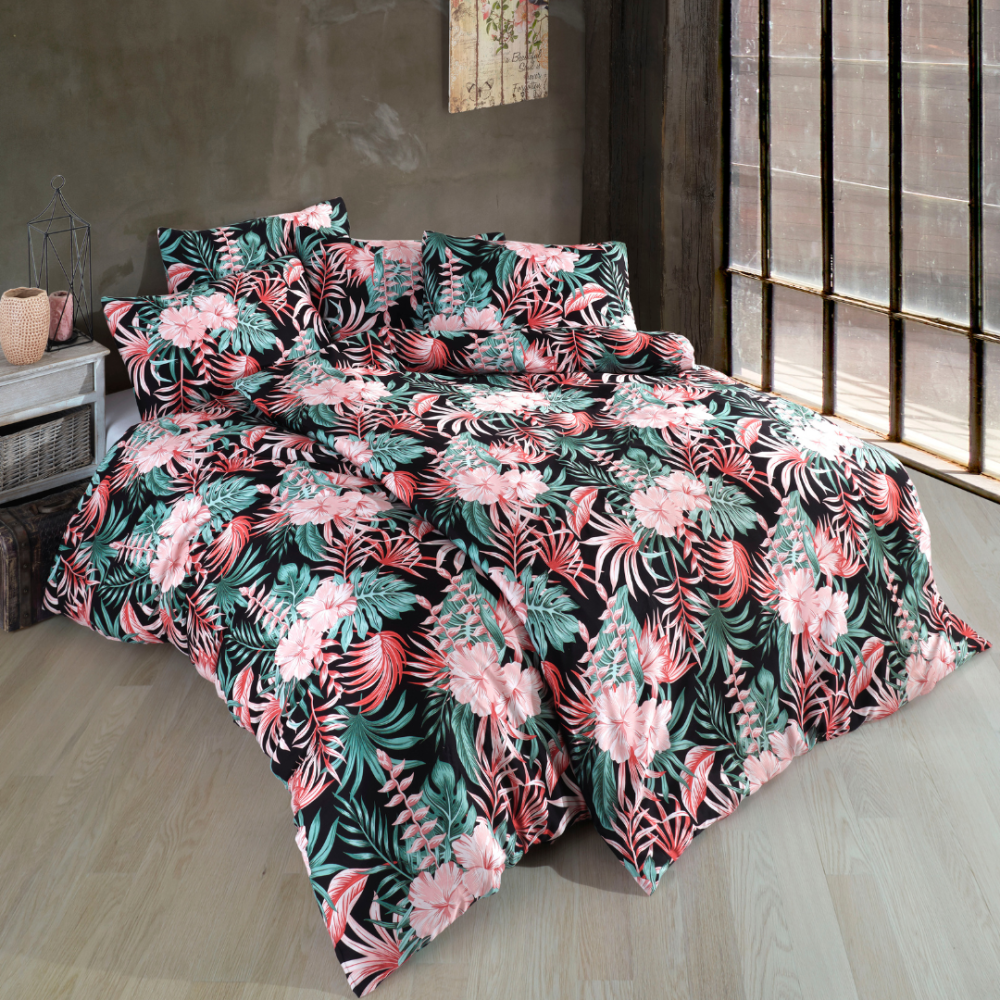 This bedding set with a black background features vivid pink and green flowers that instantly bring color and vitality to the bedroom. The striking design combines the depth and sophistication of black with bright pink and green accents, creating a bold yet elegant centerpiece.