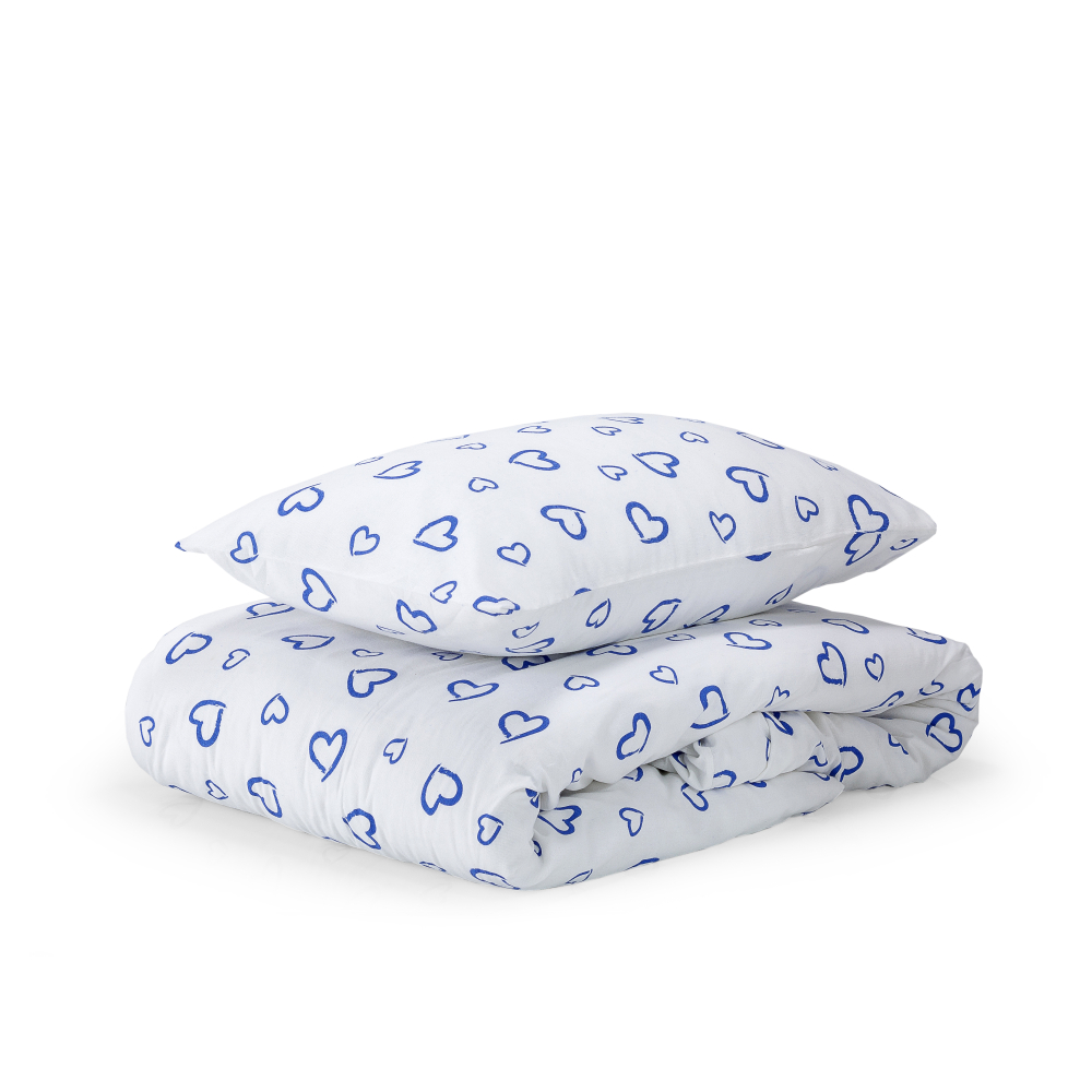 A white bedding set decorated with blue hearts is perfect for both a boy’s or a girl’s room. Its neutral white shade matches any interior, while the soft cotton flannel fabric ensures a cozy and warm atmosphere.