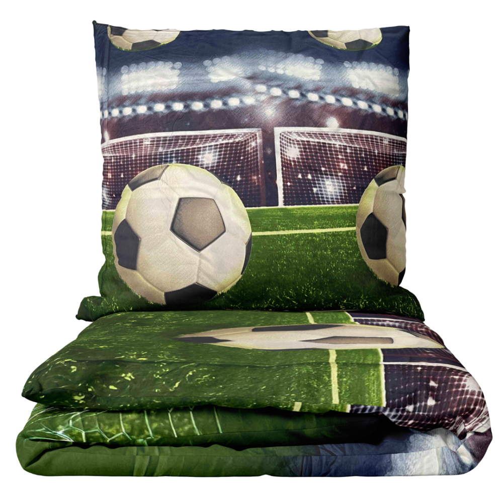This bedding design is perfect for football enthusiasts, especially children who love the sport. The pattern depicts footballs caught in the goal net, combined with vibrant green shades of the football field. The color palette includes rich green, white, black, and light blue tones that create a lively and dynamic effect.