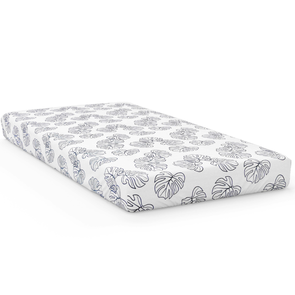 This white fitted sheet serves as the perfect canvas for a delicate and intricate dark green leaf pattern. The leaves are finely detailed, with soft edges that evoke a sense of natural beauty and freshness.