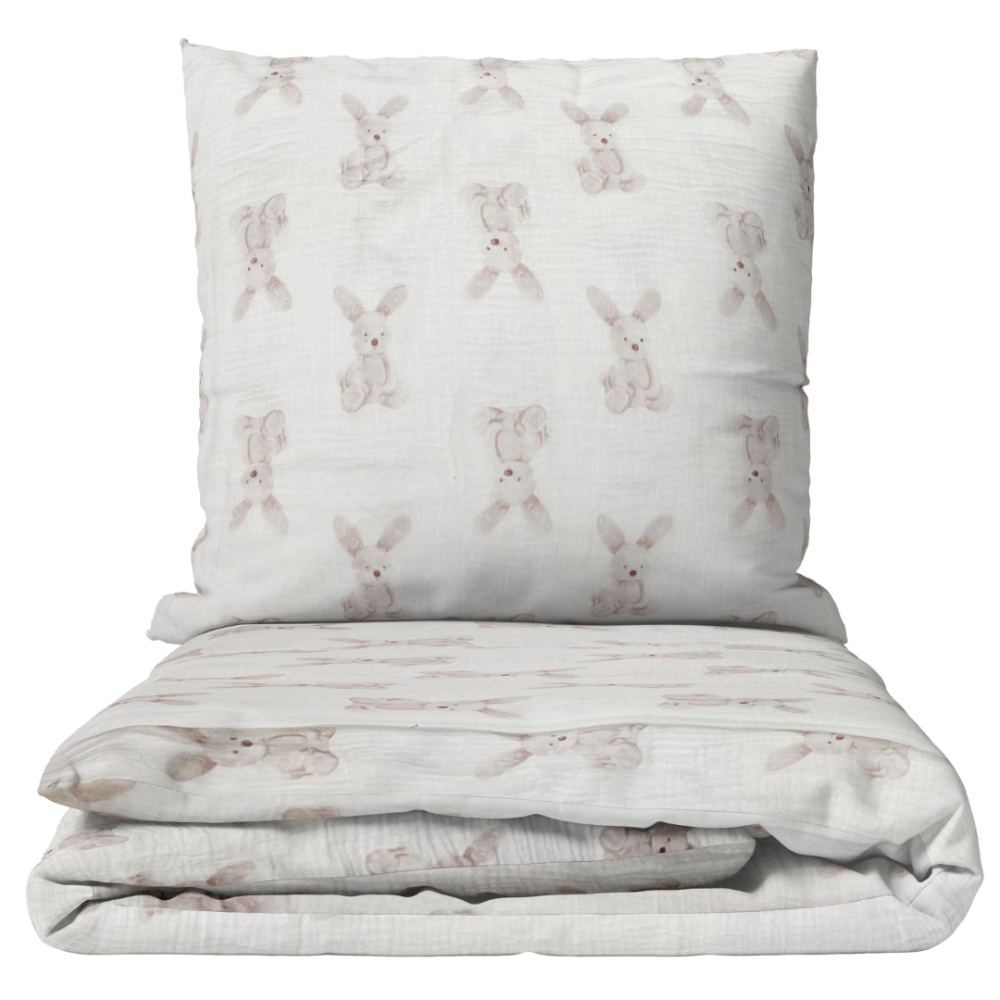 This bedding set comes in white with a subtle beige bunny pattern. The design is minimalist yet playful, featuring small, gentle bunnies that bring warmth and charm while maintaining elegance.