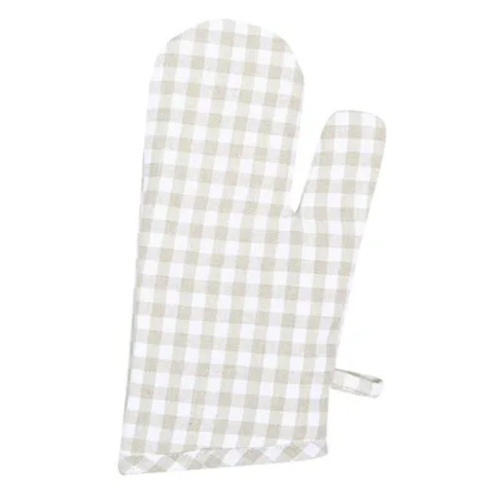 Oven mitt with a beige and white checkered design. This mitt features a soft beige background complemented by a rhythmic white checkered pattern that adds lightness and a cozy feel. The subtle color palette creates a clean and harmonious look, while the classic check motif suits both modern and traditional kitchen interiors. A practical yet stylish piece that enhances your kitchen’s overall aesthetic.