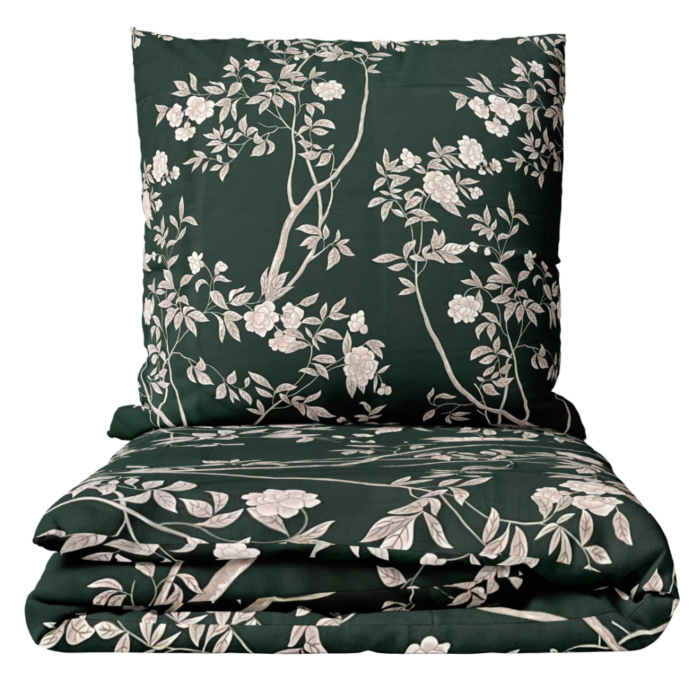 This dark green bedding set, adorned with delicate light branches and blooming flowers, creates a calm and natural atmosphere in any bedroom. The deep green background brings an earthy character, while the soft, contrasting branches and blossoms add a refreshing touch. The rich green shade combined with the light botanical design strikes an elegant, harmonious balance that soothes and revitalizes. Perfect for those who love nature-inspired décor, this bedding set will transform your space into a tranquil retreat.