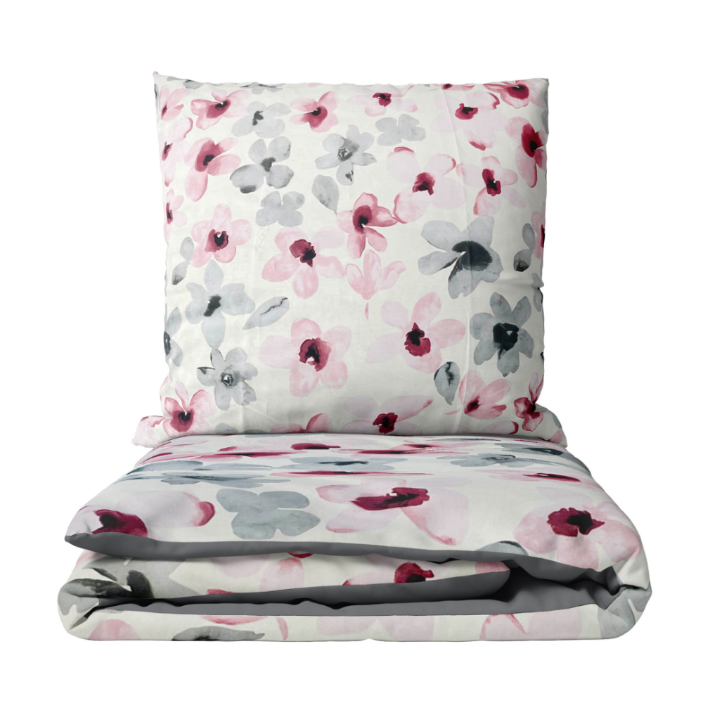 Introducing a timeless white bedding set adorned with a charming floral design in soft gray and pink shades. Enhance your bedroom décor with the elegant appeal of this exquisite ensemble, where the purity of white harmonizes effortlessly with delicate gray and blush tones.