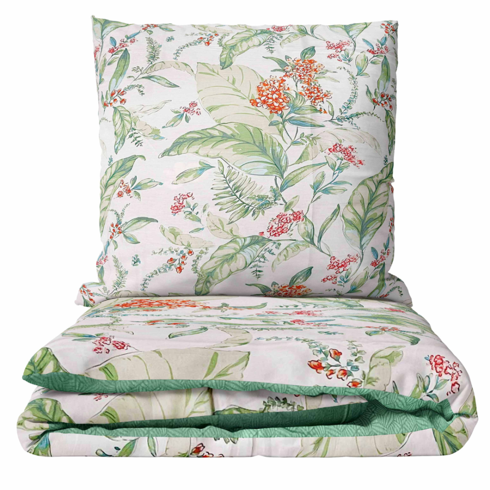 This bedding set with a beautiful floral and botanical pattern brings the beauty of nature directly into your bedroom. The colors – soft green with bright red accents – create a fresh and lively atmosphere, while the delicate plant motifs evoke blooming gardens and natural tranquility. Perfect for creating a calming space full of light and energy, this bedding design enhances any interior style, from minimalist to romantic, adding a warm and natural touch to your home.