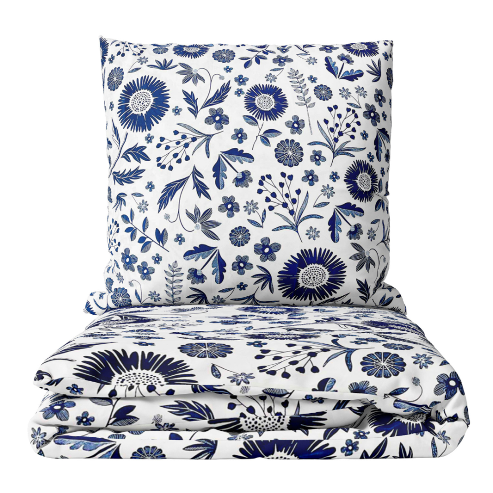 Step into your bedroom and be greeted by the serene beauty of this elegant ensemble. A white background serves as the canvas for a beautiful floral pattern that brings a sense of peace and clarity, instantly calming the senses. Gentle shades of blue flowers and leaves add freshness and vitality to the space, inspiring lively energy that lifts your mood.