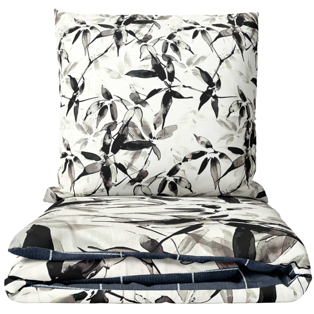 Black and white bedding set with watercolor leaf pattern. This design stands out with its subtle contrast and artistic softness, bringing a modern yet calm atmosphere to the bedroom. Gentle gray tones blend harmoniously with black leaf silhouettes, creating an elegant minimalist look. A perfect choice for those who appreciate nature-inspired contemporary elegance.