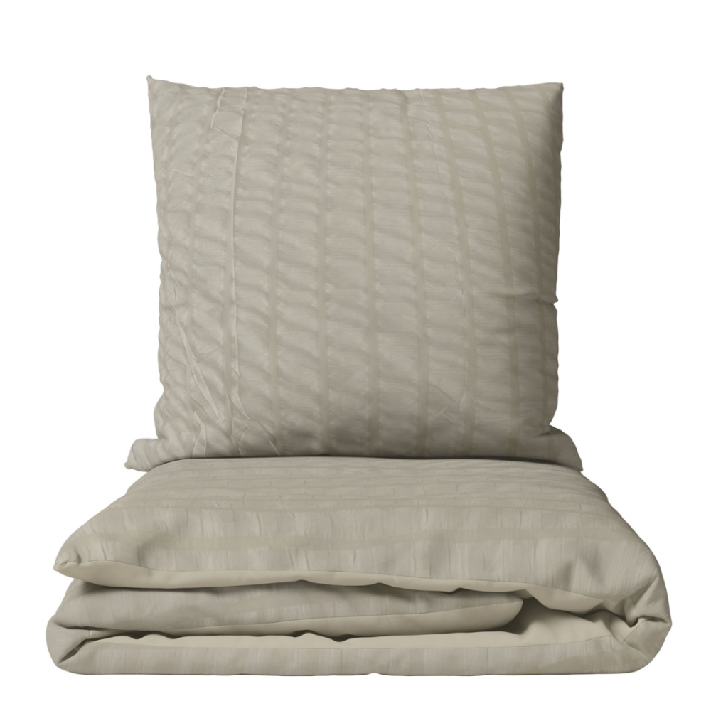 A beige striped bedding set creates a feeling of warmth and relaxation, reminiscent of a peaceful walk along the beach at sunset. The soft and subtle sand tone provides a calming and comforting backdrop in any bedroom, while the stripes add visual interest and depth to the design.