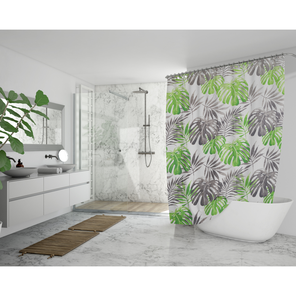 The “Rainforest” shower curtain, inspired by the lush Amazon rainforest, is perfect for those looking to add playful yet subtle accents to their bathroom. Decorated with green and grey-toned leaves, it brings a sense of freshness and calm, making it appealing to both children and adults. These fun yet versatile curtains look beautiful in any bathroom interior, adding a touch of nature and relaxation.