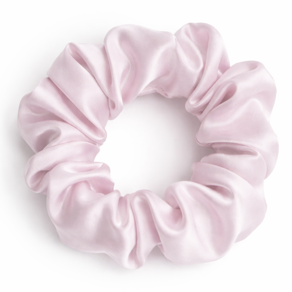 Soft pastel pink silk scrunchie in elegant tone. This silk scrunchie stands out with its delicate pastel pink shade and subtle sheen. The smooth, glossy surface creates a refined and luxurious appearance. Its solid color design gives a clean and modern aesthetic. The gentle blush tone pairs beautifully with various outfits and adds a soft feminine touch.