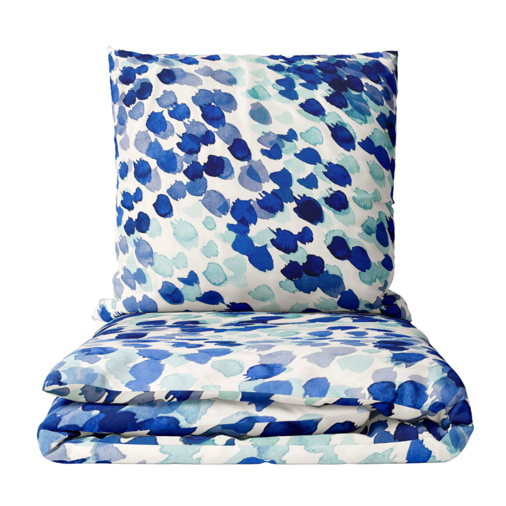 The polka dot pattern of this bedding set, with its bold sizes and vivid colors, draws attention and adds vibrant energy to your space, instantly elevating the overall aesthetic. This white bedding set with blue dots creates a blend of joy and modern elegance. The white background conveys purity and simplicity, while the blue dots bring liveliness and playfulness to the room. The result is a dynamic contrast, making your bedroom a place for both rest and creative energy. This bedding set brings a sense of modern style and artistic expression, adding vitality and boldness. Like an abstract artwork, it introduces a sense of wonder to your interior.