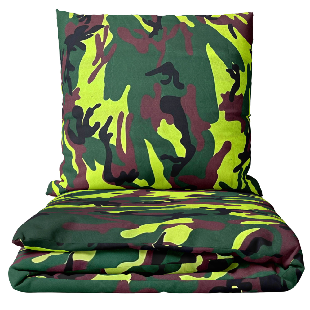 The distinctive camouflage pattern, enriched with dark green, black, and lighter shades, radiates sophistication and adaptability. These tones intertwine to create a versatile and impressive bedding set with timeless appeal, complementing various interior styles and adding a touch of solid elegance to the space.