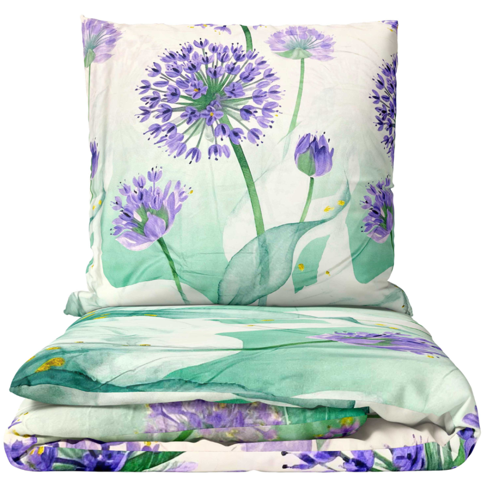 Bedding set in soft green and violet shades. The design evokes freshness and a springtime mood, reminiscent of blooming lavender fields. The pastel tones and light floral pattern create a cozy, peaceful atmosphere that fits perfectly in a bright bedroom. Its colors and motifs deliver a subtle yet lively impression suitable for both classic and modern interiors.