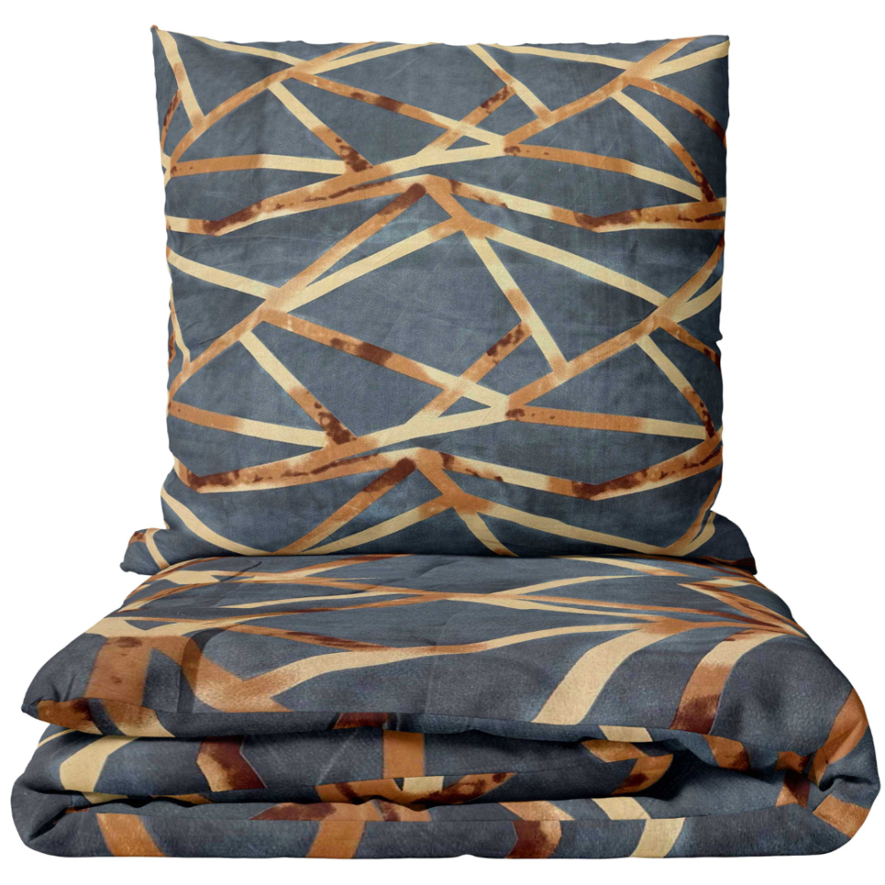 Dark grey bedding set with geometric gold line pattern. The rich graphite background is highlighted by contrasting golden lines crossing in an abstract formation. The irregular geometric design creates a bold and modern visual effect. The combination of deep grey tones and warm gold accents adds a sense of elegance and subtle luxury. It fits perfectly into contemporary or industrial-style interiors.